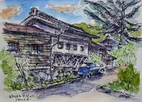 伊那谷の小さな町の“昭和の生き証人”とでも云った建物を前で、歴史に想いを馳せながらスケッチしていますと、のんびり、こんな事をしていて良いのだろうか?何んて思ったりもします。沖縄の基地の街では、まだ、まだ、戦後が続いているのですからね。。。 |