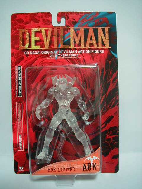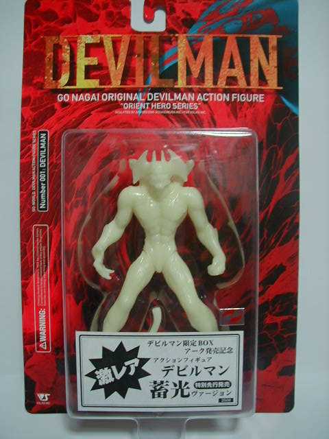 向かって左:講談社 デビルマンボックス『アーク』(ビデオ、コミック、カード等盛りだくさんの内容)に封入されていたモノ。 一応予約販売でしたが、店頭でも購入可能でした。 中央:『アーク』発売記念でボークスの店頭で販売された限定の蓄光版。 向かって右:ローソン ロッピィ限定(ショップでも購入可能でした) 1,000体限定(あやしい!)のブラック バージョン。 一躍ロッピィの存在をしらしめた一品。コレクターはこれを捜してあせりまくりの一品です。