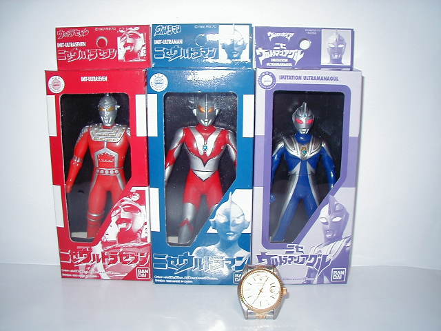 ニセ物づくし。左からセブン、ウルトラマンそしてアグルのニセモン。 手前のロレックスは....ピー....。 一応限定品ということになっています。