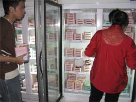 冷蔵ショーケース ショーケースの小さな四角いピンクの皿に野菜や肉、魚介類などの食材が入っているので、食べたいものを食べたいだけ自由に取ってくる。支払いは回転寿司と同じく、皿の枚数と色で食後に勘定する。 |