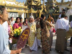沙弥出家式シンピュー シュエダゴンに来ると、ほぼ毎回のように沙弥出家の子供達に出会う。 |