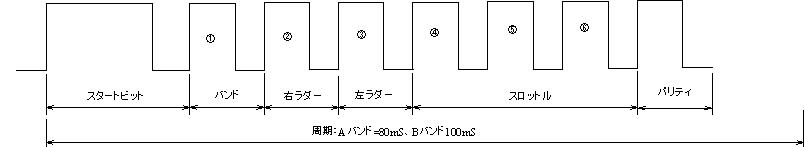 | 4 | スロットル(0〜6の7段階を3ビットの2進数で表す。ただし、通常のMSBとLSBは逆になる。) 0:000、1:100、2:010、3:110、4:001、5:101、6:011(6はぴろぴろろんサウンドコマンド) |