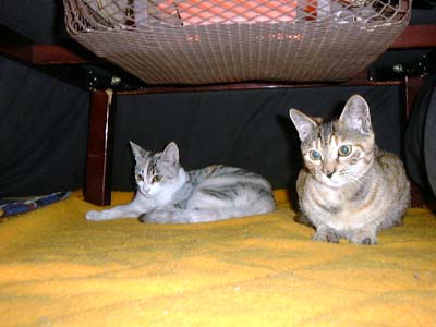 | ボクの親友たち、茅野の実家にいるニャンコに会ってきました。 右が「メイ」、左が「なな」です。 いっしょに寝て、ひっかかれて(涙)、楽しいひとときでした。 コタツの中に待避しているところを激写。 |